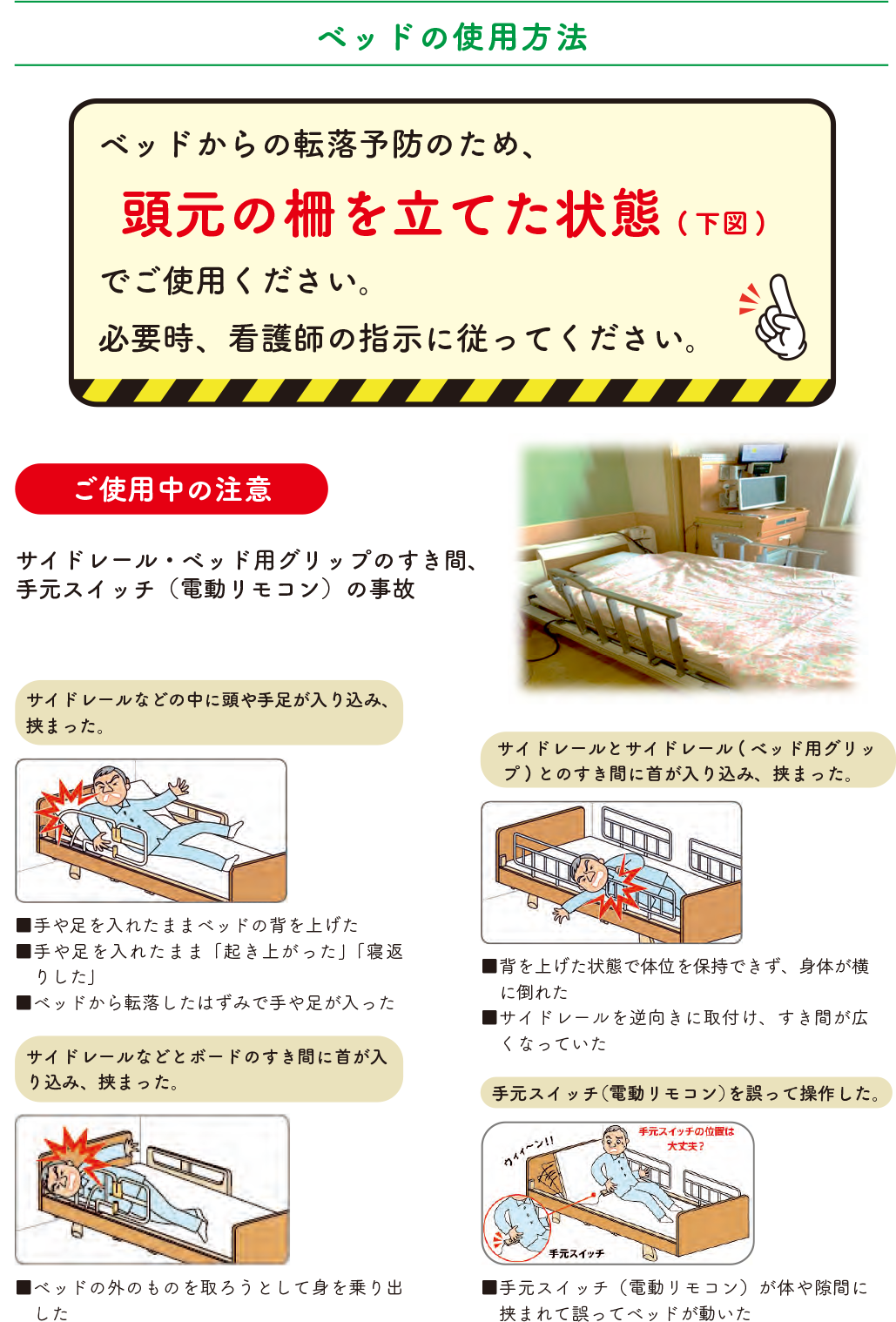 皆様が安全な入院生活が送れますように、実際に転倒・転落をしやすい場面と、その予防方法について説明させていただきます。