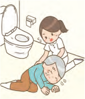 トイレや洗面化粧台の周囲の床はとくに濡れやすく注意が必要です。床が水などで濡れている場合は、看護師にお声掛けください。